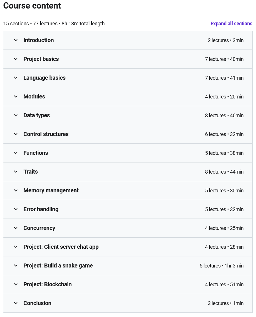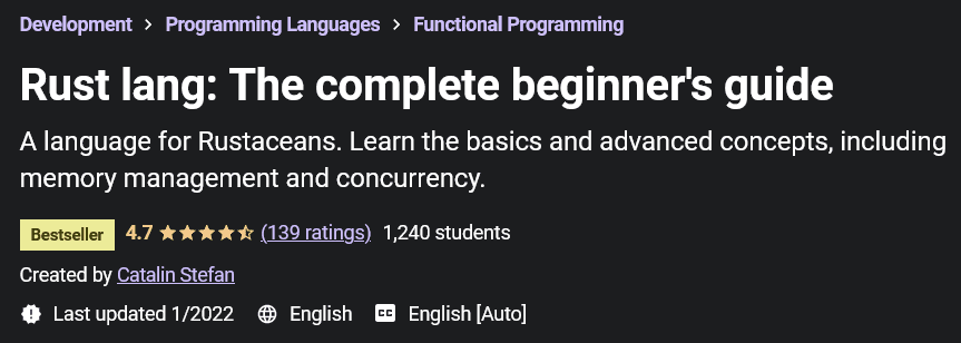 Rust lang: The complete beginner’s guide 是 Udemy Academy 出版的 Rust 编程语言 (Rust) 入门课程。本课程涵盖内存管理和并发等非常高级和专业的语言主题,是 Udemy 网站上 Rust 编程领域最全面的培训课程之一。 Rust 是一种非常快速和现代的编程语言,由于其简单流畅的语法,不同的人可以轻松学习。这种语言最重要的优势之一是管理内存和高级垃圾收集器的能力。 Rust 很快在编程语言中找到了一个非常好的位置,现在被成千上万的大大小小的公司用于各种设备,例如嵌入式系统、低功耗设备、跨平台系统等。