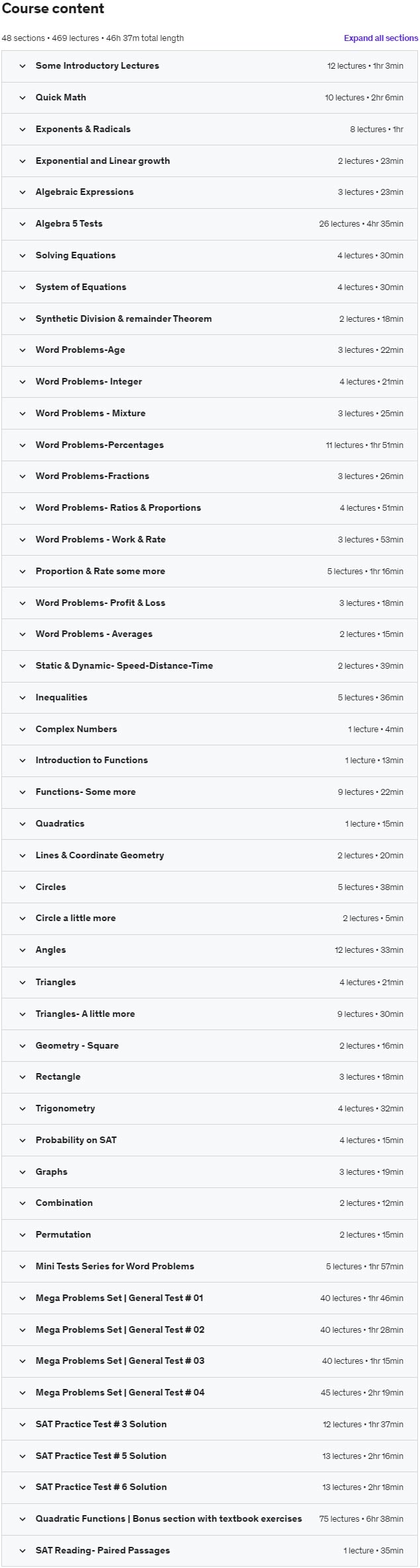 添加了三个带有解决方案和解释的通用大型测试。每个测试包含 40 个高级问题。在这些测试中,详细讨论了各种应用题。还添加了来自大学委员会网站的三个实践测试,每个问题都已解决,更多测试即将推出。目标是解决大学理事会网站上提供的所有 10 个测试。在接下来的几周内,该课程将增加到大约 50 小时。有些同学对二次函数总是有问题。最后,增加了第二学位课程的完整部分,并使用教科书问题和示例进行了详细讨论。这解决了与二次函数相关的所有歧义。这门 SAT 数学课程超出了学生的预期。