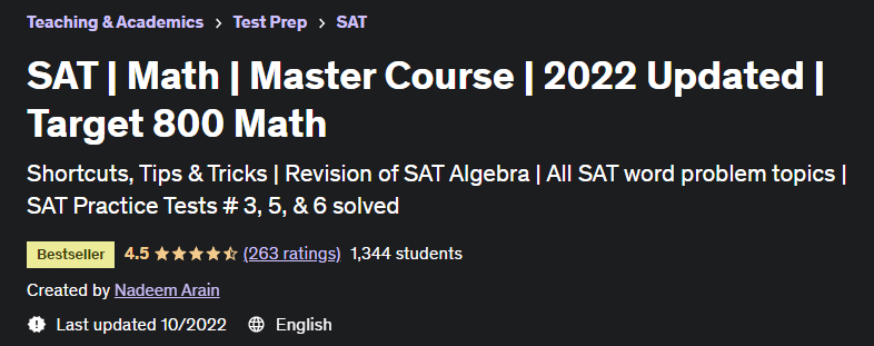 SAT 数学硕士课程 2022 更新了 Udemy Academy 发布的 Target 800 Math。捷径、提示和技巧 SAT 代数复习 |所有 SAT 单词问题主题 | SAT 练习测试 #3、5 和 6 已解决。