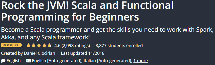 Rock the JVM Scala and Functional Programming for Beginners是一套Scala编程语言和函数式语言学习视频教程的名称。作为基础课程,您前面的课程将教授您所需的所有基础知识。为了成为一名熟练的 Skala 程序员,您需要具备使用不同框架(如 Spark、Akka 等)的良好技能。