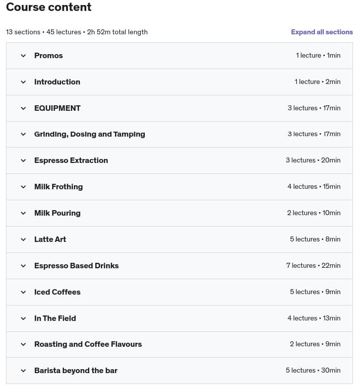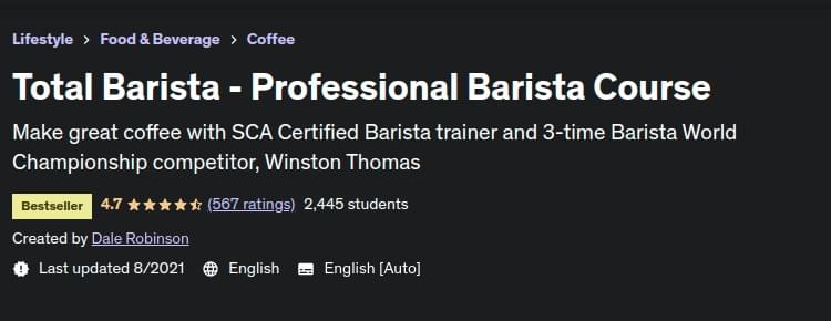 • 适合所有级别咖啡师的完整咖啡师课程。由 SCA 认证的专业咖啡师培训师和屡获殊荣的咖啡专家 Winston Thomas 设计和展示。 “Total Barista”涵盖所有级别的咖啡师培训。无论您只是想制作美味的咖啡还是成为专业的咖啡师,本课程都适合您。