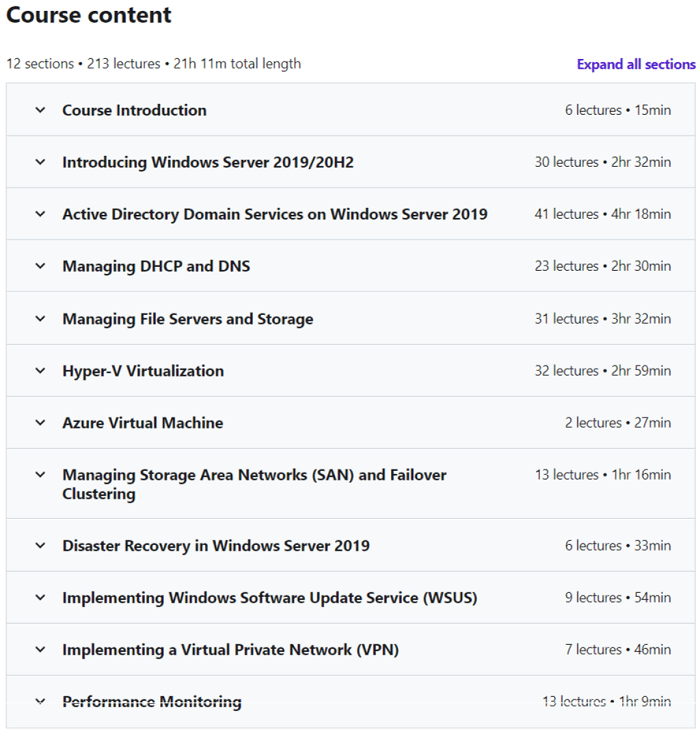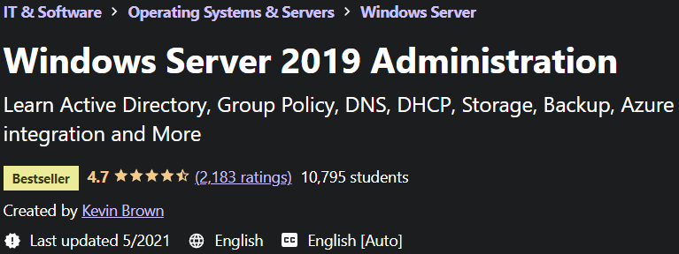Windows Server 2019 Administration 是 Udemy Academy 发布的有关管理和使用 Windows Server 2019 的培训课程。超过 20 小时的教学视频将向您传授系统管理员、网络管理员、工程师或云架构师需要了解的有关 Windows Server 2019 / 20H2 的一切知识。有一点 Windows Server 经验会有所帮助,但不是参加本课程所必需的。本课程涵盖的一些主题如下: