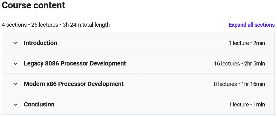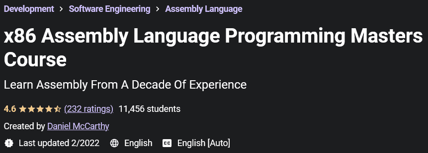 x86 Assembly Language Programming是Udemy Academy发布的32位汇编程序设计硕士课程。本课程涵盖处理器处理 (CPU) 和机器代码生成 (machine code) 等重要主题,并将教授与计算机和计算机系统底层相关的非常重要的知识点。使用软件模拟器,可以模拟老牌Intel 8086电脑,得到稳定性(registration)和内存模型(memory partition model)。模拟器非常易于使用,用户可以随时单击按钮,查看处理器的步骤和信息流。在回顾了旧的 Intel 8086 处理器之后,他熟悉了新处理器的特性和功能,并学习了如何使用汇编对其进行编程。