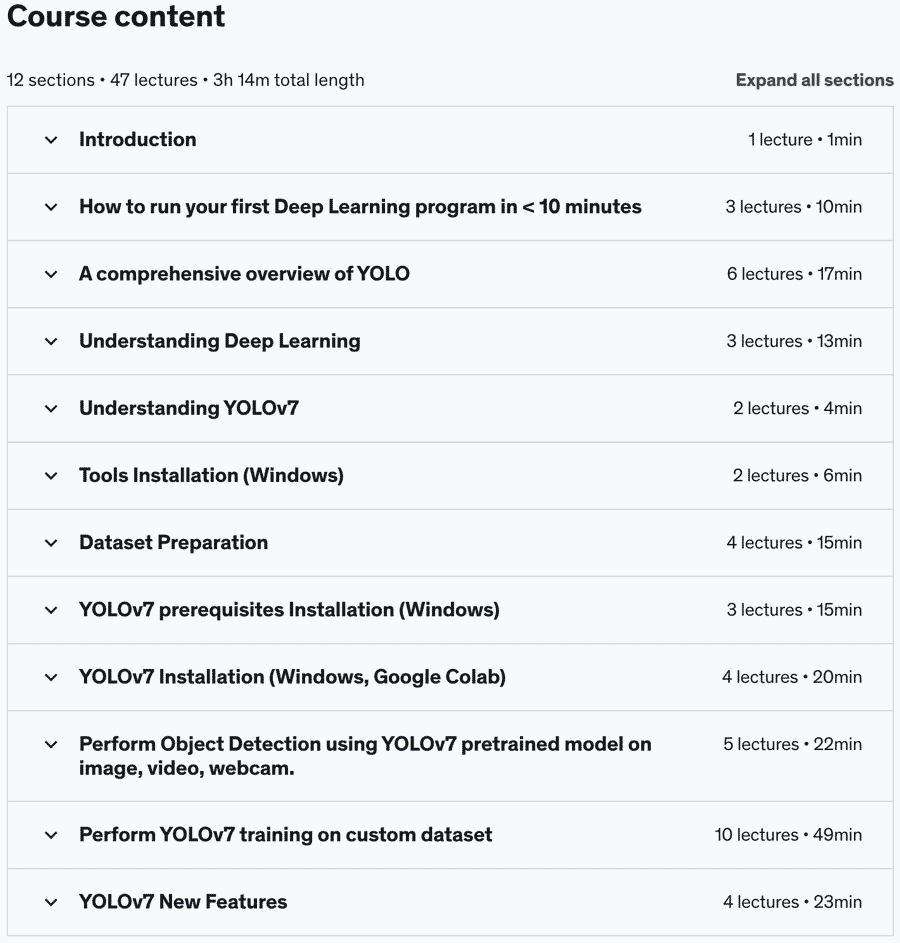 YOLOv7 Masterclass: Deep Learning – Computer Vision Course是Udemy Academy出版的YOLO物体识别算法第7版以及深度学习和机器视觉算法的培训课程。本次培训课程涵盖了与YOLO算法相关的一系列主题,例如个性化和新数据集的评估、实践和训练、同步和即时目标检测、头部旋转(Pose Estimation)、图像分割、LabelImg等。在过去的几年中,许多算法和模型进入了竞赛领域与YOLO一较高下,但没有一个算法和模型能像YOLO一样准确和快速。与其他可用选项相比,Yolo 的性能非常优化和高效,可用于广泛的不同项目。